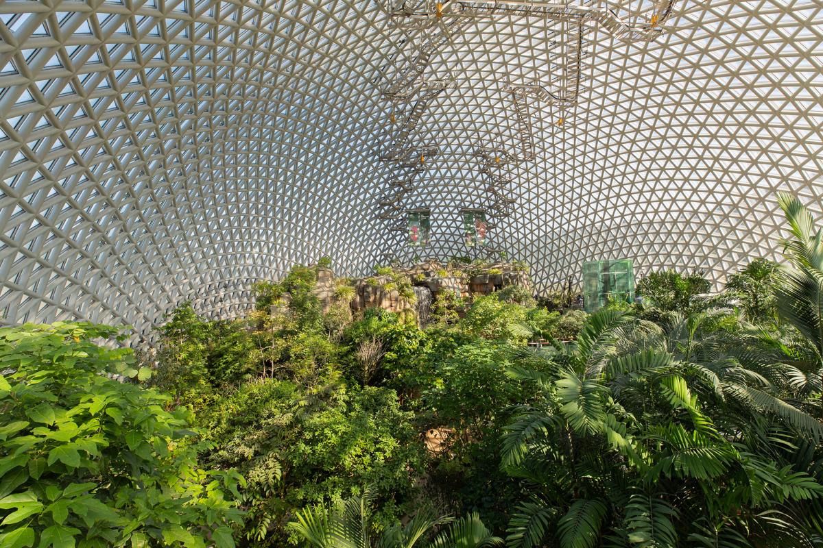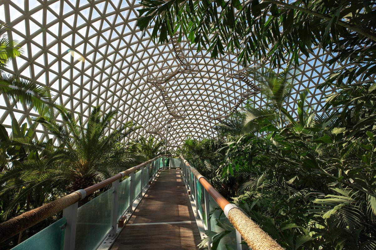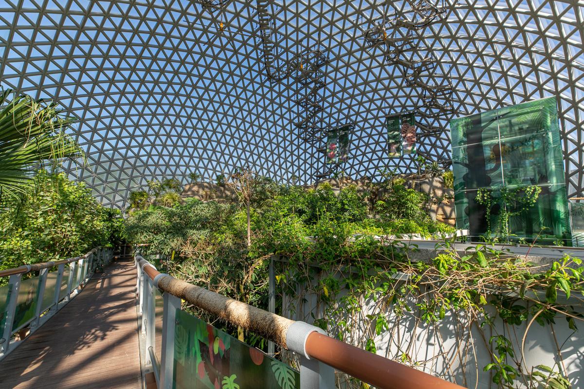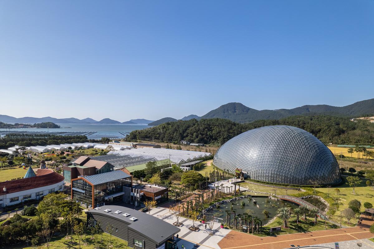 Geoje Botanical Garden (Geoje Jungle Dome) is the largest botanical garden in Korea, covering an area of 4468 square meters, a maximum height of 30 meters, and covered with 7472 sheets of glass. There are 10,000 kinds of tropical trees of 300 species inside the dome, and there are various attractions such as Seokbujak Flower Garden, Seokbujak Valley, Photo Zone, Cactus Garden, Black Pansoo, and Cave of Light.