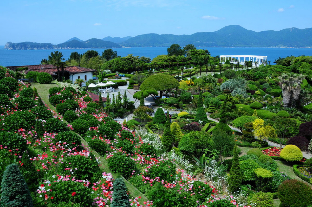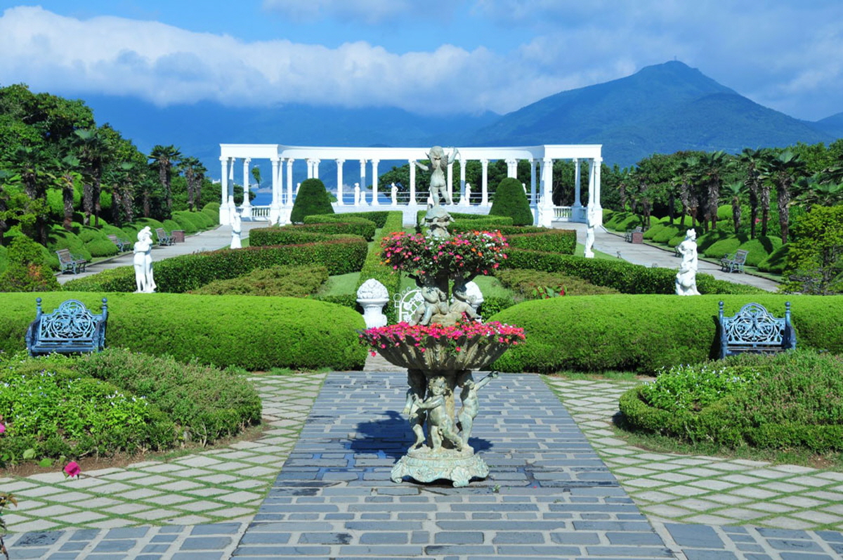 A marine botanical garden beautifully decorated with buildings and landscaping that look like they've been taken straight from a beach town in the Mediterranean.